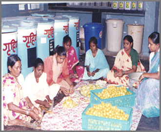 Keeping in mind the International parameters & standards, GRIHINI organises Food processing & preservation and other productive programmes. The trained women are involved in production of items like Spices, Pickles Papad, Murabba which are being sold in market under the brand name (GRIHINI) since 1996. Around 400 women from nearly 15 villages are involved in these activities. These products are used in the preparation of mid day meal in the schools. It has been the sincere effort of the organization to provide training to women in conducive environment at its training centre by skilled trainers.