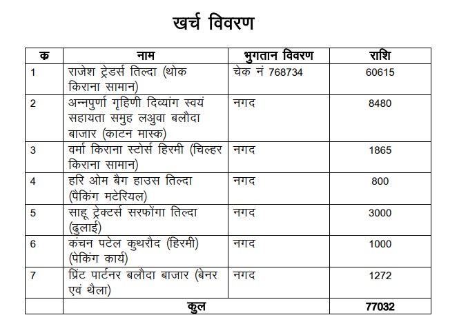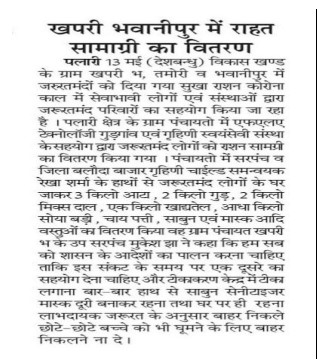 कोरोना महामारी की वजह से जिंदगियां अस्त व्यस्त हो गयी है ऐसे में देहाडी मजदुरी कर परिवार के लिए रोजाना भोजन जुटाने वाले मजदुरो के लिए यह समय काफी दिक्कतो भरा हो गया है ऐसे में बहुत सारी समाज सेवी संस्थाये आगे आयी है और जरूरतमंदों को सहायता पहुॅचा रही है जिसमें FIA टेक्नोलॉजी गुरगाँव के द्वारा गृहिणी स्वयं सेवी संस्था को जरूरतमंद गरीब परिवारों को राहत सामाग्रीयां पहुचाने का जिम्मा सौपा जिस पर कार्य प्रारंभ करते हुए बलौदा बाजार जिले के ग्रामीण क्षेत्र में निवासरत सबसे ज्यादा जरूरतमंद जैसे जिनके परिवार में कोई काम करने वाला न हो, दिव्यांग हो या कुपोषित बच्चे हो, गंभिर बीमारी से ग्रस्त हो, बच्चो के साथ अकेली महिला हो या वृद्यावस्था के कारण परिवार आवश्यक राशन न जुटा पा रही हो बलौदा बाजार जिले के चार विकास खण्डो के 17 गाँवो से ऐसे 100 परिवारो का चयन कर FIA को अवगत कराया तत्पश्चात अनुमानीत बजट पर चर्चा कर 85000.00 अक्षरी पच्चयासी हजार रूपये का सहयोग किया गया । FIA टेक्नोलॉजी से हुई अप्रूवल के आधार पर संस्था नें 100 परिवारों हेतु 1लीटर तेल, 2किलो ग्राम गुड, 3 किलो ग्राम आटा, 2 किलो ग्राम मिक्स दाल, आधा किलो ग्राम सोयाबडी, 80 ग्राम चायपत्ती जैसी दैनीक उपयोग की वस्तुओं के साथ कारोना जैसे खतरनाक बीमारी से बचाव हेतु आधा दर्जन नीम साबुन व 4 नग काटन मास्क की खरीदी कर संस्था अपने देख - रेख में उपरोक्त सामानों का पैकेट तैयार करवाया तथा अपने कार्यकताओं के सहयोग से चयनित परिवारो को पंचायत प्रतिनिधियो व गणमान्य नागरिको के साथ मिलकर घर घर जाकर राहत सामाग्री वितरण किया । सामाग्री मिलने से लाभार्थियों तथा ग्रामीणो में हृदय - छलक उठी और FIA टेक्नोलॉजी गुरगाँव एवं सहयोगी गृहिणी संस्था के इस कार्य के लिये धन्यवाद ज्ञापित करने से नही चुक रहे थे ।