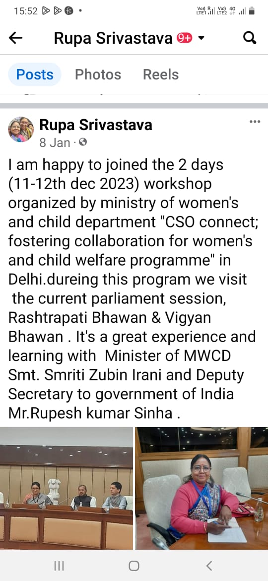 I am happy to joined the 2 days (11-12th dec 2023) workshop organized by ministry of women's and child department "CSO connect; fostering collaboration for women's and child welfare programme" in Delhi.dureing this program we visit the current parliament session, Rashtrapati Bhawan & Vigyan Bhawan . It's a great experience and learning with Minister of MWCD Smt. Smriti Zubin Irani and Deputy Secretary to government of India Mr.Rupesh kumar Sinha .